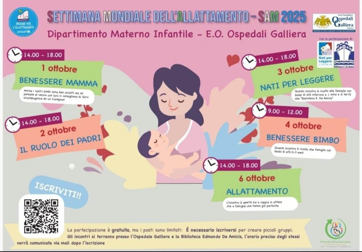 In occasione della Settimana Mondiale dell’Allattamento (SAM) 2025, dal primo al 6 ottobre, il Dipartimento Materno Infantile dell’E.O. Ospedali Galliera propone un ricco calendario di incontri e attività gratuite dedicate alle famiglie, con l’obiettivo di promuovere, sostenere e valorizzare la cultura dell’allattamento e della genitorialità consapevole.